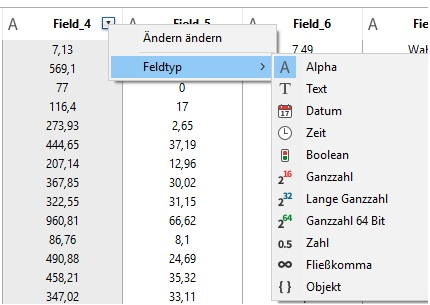 Neue Tabelle für den Datenimport erstellen. Markieren Sie dazu das Kontrollkästchen Erzeuge Tabelle. 4D erstellt dann eine neue Tabelle, in welche die Daten importiert werden sollen. 4D legt anhand der importierten Daten die Anzahl der benötigten Felder und den jeweiligen Typ fest. Wollen Sie den Namen der neuen Tabelle bzw. des Feldes ändern, doppelklicken Sie im Auswahlbereich darauf, damit sie eingebbar werden oder markieren Sie die Option Spaltentitel als Feldname auf der Seite Kopf). Wollen Sie den Datentyp ändern, klicken Sie in der Vorschau in die Titelleiste des entsprechenden Feldes und wählen im DropDown-Menü einen anderen Datentyp: Diese Tabelle wird nur während dem Import erstellt. Brechen Sie den Import ab oder deaktivieren Sie diese Option, bleibt die Struktur der Datenbank unverändert. Hinweis: Über das Kennwort-Zugriffssystem können Sie die Option Erzeuge Tabelle auch deaktivieren, so dass Benutzer während dem Importieren in die Datenbank keine neue Tabelle erstellen können. Legen Sie dazu in den Datenbank-Eigenschaften eine Gruppe mit Zugriff auf den Designmodus fest - dazu muss natürlich zuvor das Kennwortsystem von 4D aktiviert sein. Benutzer, die nicht zu dieser Gruppe gehören, können dann im Importdialog nicht die Option Erzeuge Tabelle auswählen.