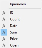 Ändern Sie bei Bedarf im Bereich Vorschau die Felder, in welche die Daten importiert werden sollen. Hinweis: Diese Option ist nicht verfügbar, wenn Sie für den Import ein Formular verwenden oder das Kontrollkästchen Erzeuge Tabelle markiert ist. Die Kopfzeile jeder Spalte zeigt den Namen des importierten Feldes und über das vorangestellte Icon den Typ an. Sie können bei Bedarf das DropDown-Menü aufklappen und ein anderes Feld auswählen.