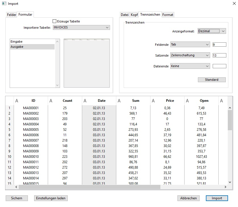 Wählen Sie die zu importierende Datei und klicken auf die Schaltfläche Öffnen. Auf dem Bildschirm erscheint der Importeditor: