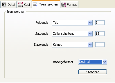 Ausführliche Informationen dazu finden Sie im Abschnitt Begrenzer für Datenfeld, Datensatz und Datei. Über die DropDown-Liste können Sie die Standard Trennzeichen ändern. Sie zeigt die am häufigsten verwendeten Formate für Trennzeichen. In den Eingabebereichen können Sie auch direkt ein Trennzeichen vorgeben. Über das DropDown-Menü Anzeigeformat lassen sich die Trennzeichen in verschiedenen Formaten anzeigen: Zeichen, Dezimal (Standardformat) und Hexadezimal. Beachten Sie, dass die Option Zeichen bei nicht-druckbaren Zeichen als Begrenzer, wie Tabulator, Zeilenvorschub und Zeilenschaltung nichts anzeigt.