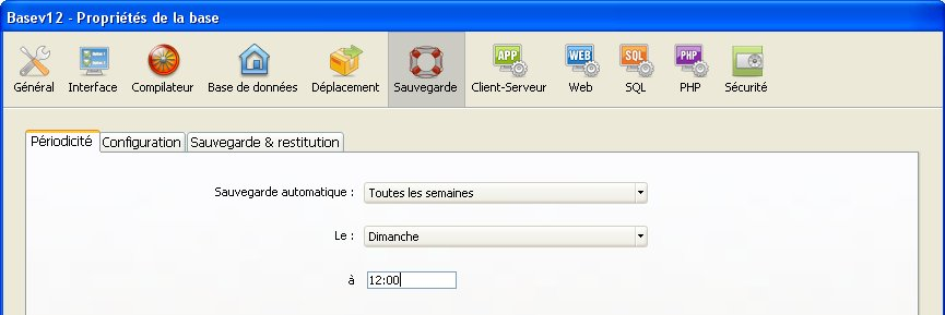 Les paramètres des sauvegardes périodiques sont définis dans la DOM REMOVE XML ATTRIBUTE des Propriétés de la base :