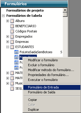 3. Clique com o botão direito no nome do formulário a atribuir e selecione o comando Formulário de entrada ou Formulário de saída no menu contextual: