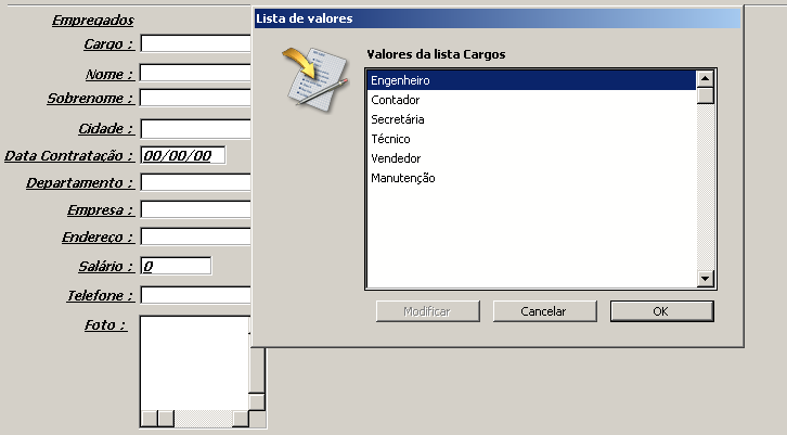 4D permite criar uma lista obrigatória como parte dos controles de entrada de dados. Este tipo de controle de entrada de dados evita que o usuário introduza um valor diferente aos valores da lista. Por exemplo, sua empresa pode ter um grupo específico de cargos autorizados no banco de dados de pessoal.