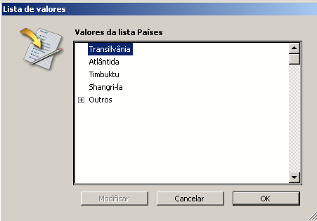Outro controle de entrada permite excluir os valores de uma lista. O usuário não pode introduzir um valor excluído. Por exemplo, sua empresa pode não estar autorizada a fazer negócios em certos países. Se você colocar este países em uma lista de excluídos, evita que eles sejam introduzidos.