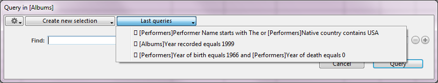 Pode guardar suas condições de procura no disco e abrí-las quando queira repetir a procura. O editor de procuras lembra sua última consulta. Pode editar a consulta ou apagá-la e introduzir uma nova consulta. Pode procurar nos campos da tabela atual como também nos campos das tabelas relacionadas.