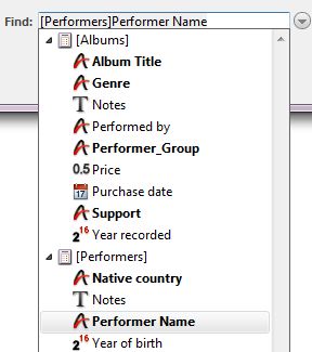 Para designar o campo, pode utilizar a lista hierárquica localizada a direita da área de edição: Também pode fazer clique na área de edição e escrever um nome de tabela (não escreva o "["): um mecanismo de predição de texto mostra propostas que coincidem com o que escreve: Uma vez escolha a tabela, pulse o botão da flecha direita para validar a proposta e acessar a lista de campos. Logo pode introduzir a(s) primeira(s) letra(s) do nome do campo ou utilizar as flechas acima/abaixo para se deslocar através dos campos da tabela: Esta lista mostra todas as tabelas e campos da base. Se uma estrutura virtual se especifica utilizando os comandos SET TABLE TITLES e SET FIELD TITLES esta é levada em conta