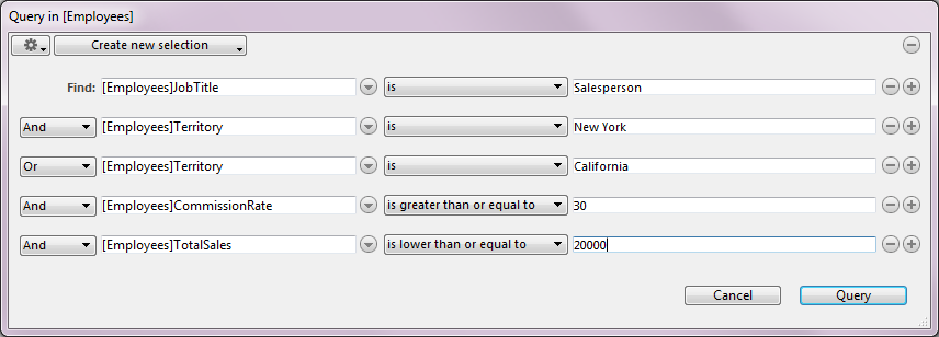 Os operadores de conjunção permitem criar pesquisas compostas, como “Encontrar o pessoal de vendas em São Paulo ou Rio de Janeiro que recebam comissões superiores a 30% e que tenham vendas menores ou iguais a $20.000". A seguinte imagem mostra uma pesquisa especificada no editor de pesquisas: