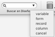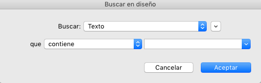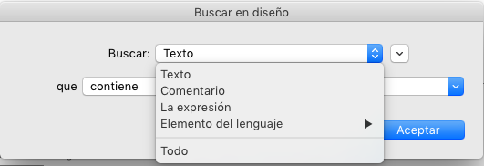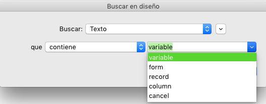 • contiene: busca la cadena entre los textos en el entorno Diseño. La búsqueda de "var" puede encontrar "mivar", "variable1" o "aVariable".
