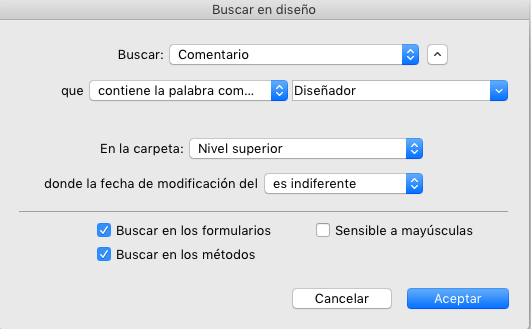 • Texto: en este caso, 4D busca una cadena de caracteres en todo el entorno Diseño.