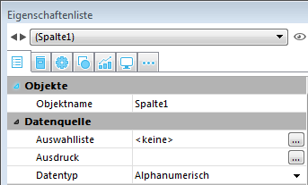 Hier bestimmen Sie das Anzeigeformat der Werte in den Spalten und die Eigenschaft Unsichtbar. Die Optionen variieren, je nach dem Variablentyp, der unter der Gruppe Objekte definiert wurde.