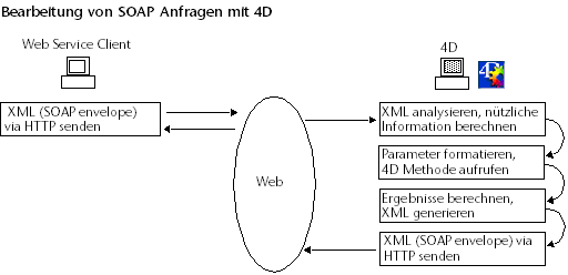 Der 4D Web Server verwaltet den Web Service, sowie Veröffentlichung und Pflege der WSDL Datei automatisch. 4D analysiert (parsing) den XML Inhalt der Anfrage, formatiert die Parameter, sendet die Ergebnisse, etc.. Dafür ist keine spezifische Programmierung erforderlich.