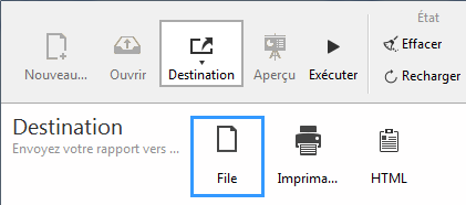 La fenêtre de sélection de destination apparaît, vous permettant de sélectionner la destination : Fichier, Imprimante ou HTML.