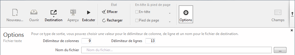 Lorsque la destination de l'état est "Fichier texte", les options suivantes sont disponibles :