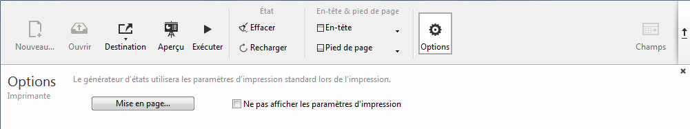 - Ne pas afficher les paramètres d'impression : lorsque cette option est cochée, cliquer sur le bouton Exécuter lance directement l'impression de l'état sur l'imprimante courante, sans que la boîte de dialogue d'impression apparaisse.