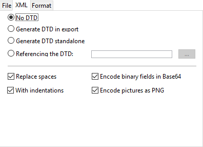 Sin DTD (opción por defecto): cuando marca esta opción, no se genera un DTD durante la exportación. El documento XML generado no puede ser “validado”.