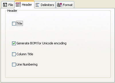 このオプションはデフォルトで選択されていますが、書き出しにUnicode 文字セットが選択されているときにのみ有効です。そうでない場合BOM は追加されません。 - 列タイトル: このオプションは、書き出しファイルの最初の“レコード”としてフィールド名を書き出します。