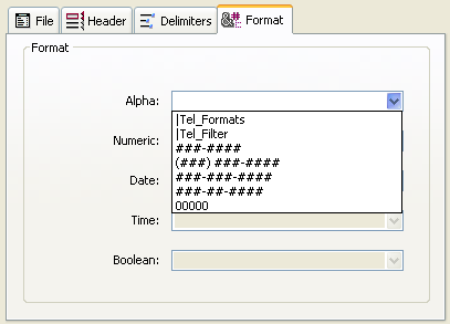 区切り文字 (デリミター) については、フィールド、レコード、ファイルの区切り文字で詳しく説明しています。デフォルトの区切り文字を変更するには、ドロップダウンリストに表示される、各区切り文字として最も頻繁に用いられる値から選択します。また、右側の入力エリアに区切り文字を直接入力して指定することも可能です。