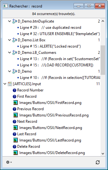 Vous pouvez double-cliquer sur une ligne de la fenêtre pour afficher l’objet trouvé dans l’éditeur correspondant. Si vous effectuez successivement plusieurs recherches, chacune provoque l’ouverture de sa propre fenêtre de résultat.