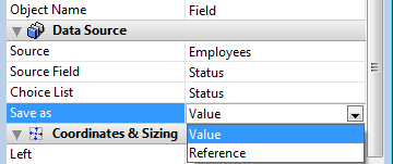 When you associate a choice list and a required list with a field or variable, you can use the Save as Value/Reference option available in the "Data Source" theme of the Property List.