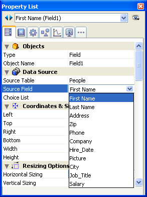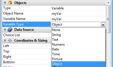 To change a variable into a field or a field into a variable, select the object and select Field or Variable from the Type drop-down list in the Property List (“Objects” theme). The Property List is then updated to display the properties for that new object type. The object name, object method, and its properties (size, enterable and so on) remain identical.