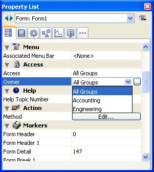 プロパティリストでフォームプロパティを表示する。 アクセス権 およびオーナー ドロップダウンリストを使用して、希望するアクセス権を指定する。 それぞれのドロップダウンリストには、既存のグループ名が表示されます。 [...]ボタンを使用すると、4Dのツールボックス上で直接グループエディタにアクセスすることができます。フォームプロパティ (エクスプローラー) ダイアログボックスを使用してアクセス権を割り当てることもできます。