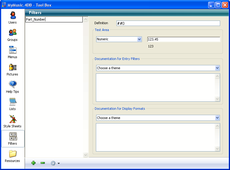 - Select Tool Box > Filters and Formats in the Design menu of 4D.