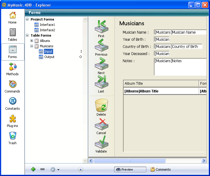 To delete a form, select its name in the list and click on the delete button or use the Delete Form command of the context menu. You can also drag and drop the form into the Trash.