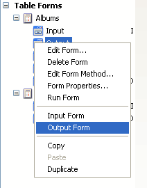 You can designate the current input and output forms for each table using the Explorer (table forms only). To do this, click the desired form name in the hierarchical list and then use the Input Form or Output Form commands of the context menu: