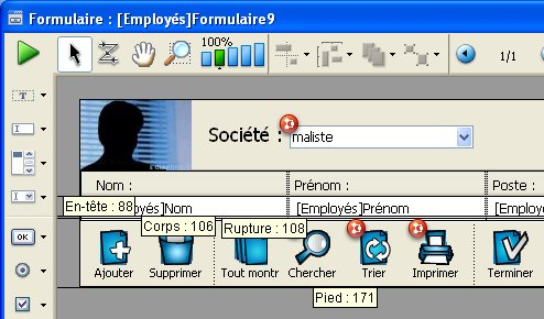 • La zone d’en-tête et/ou la zone de pied de page du formulaire peut contenir des boutons, pop up menus, etc.