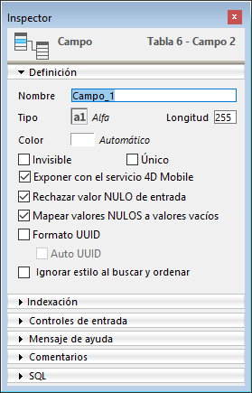 Nota: en 4D, los campos también puede tener el atributo "Obligatorio". Los dos conceptos son similares, pero su alcance es distinto: el atributo "obligatorio" es un control de entrada, mientras que el atributo "Rechazar valor NULO de entrada" trabaja a nivel del motor de la base de datos.