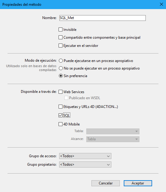 End SQLUna propiedad de seguridad se ha añadido para los métodos proyecto 4D: Disponible vía SQL: