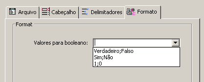 A sintaxe a ser aplicada é True_Valor;False_Valor. Por exemplo, se você importa um campo de tipo booleano cujos valores são, por exemplo, “Negro” (para true) e “Branco" (para false), é possível introduzir Negro;Branco. O combo-box mostra os tipos de formatos booleanos mais utilizados. Você pode introduzir outro formato que não esteja no combo-box.