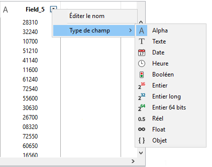 La barre de titre de chaque colonne indique le type (sous forme d’icône) et le nom du champ importé. Vous pouvez cliquer dans cette barre pour afficher la liste des champs de la table d’import et modifier le champ devant accueillir les données de cette colonne.