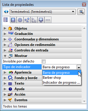 • Para los indicadores de progresión, estas variantes se definen utilizando la propiedad Tipo de indicador  del tema "Mostrar" de la lista de propiedades: