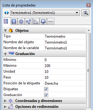 Además de las propiedades estándar de apariencia y ubicación, puede definir otras propiedades específicas para cada indicador: valor mínimo, valor máximo, unidades de graduación, los mínimos pasos permitidos por el indicador como también las opciones de visualización.
