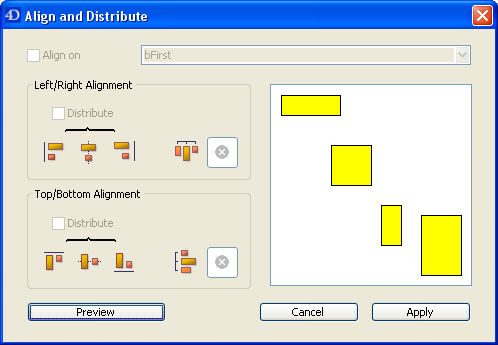 この場合、4Dは整列の方向に最も遠いオブジェクトをアンカーとして使用し、他のオブジェクトをそのオブジェクトに揃えます。例えば一連のオブジェクトに右揃えを適用すると、一番右のオブジェクトがアンカーとして使用されます。