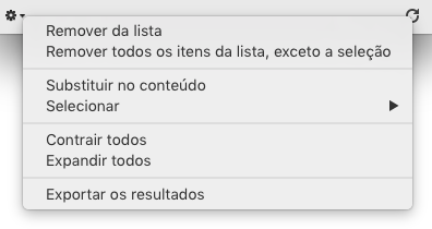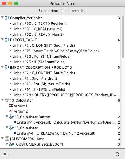 A janela de resultados mostra os resultados como uma lista hierárquica organizada por tipo de objeto encontrado. Pode expandir ou contrair todos os elementos utilizando os comandos correspondentes do menu de opções (encontrado na parte inferior esquerda da janela) ou do menu contextual.
