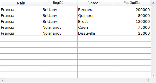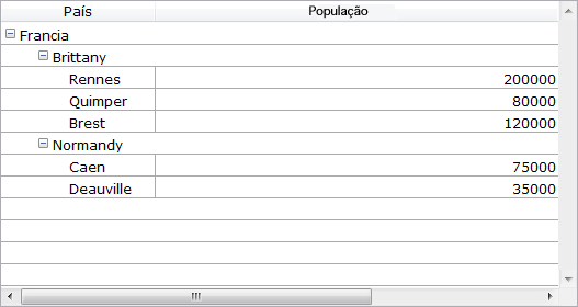 Uma linha de ruptura e um "nodo" hierárquico são agreagadas automaticamente ao list box quando os valores se repetem nos arrays. Por exemplo, imagine um list box que contém quatro arrays especificando as cidades, cada cidade é caracterizada pelo seu país, sua região, seu nome e seu número de habitantes: