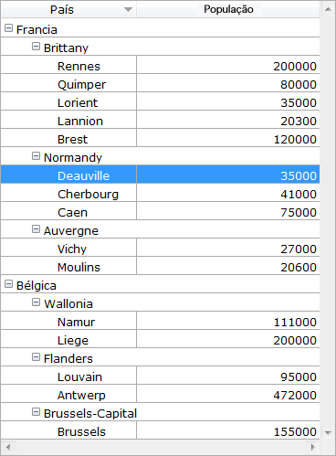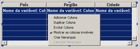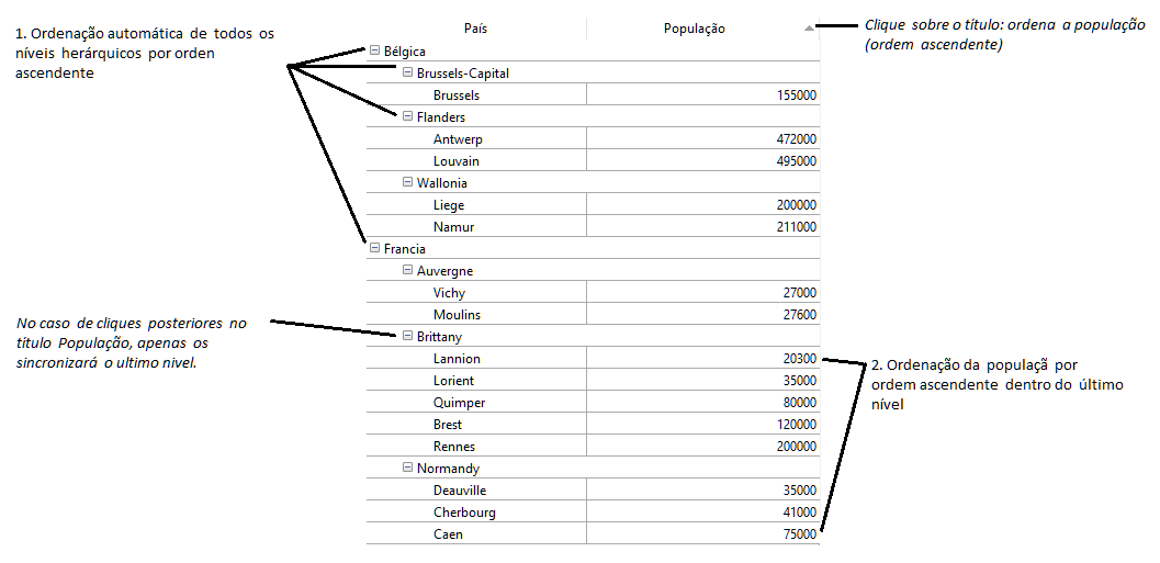 Exemplo: dado um list box cujas primeiras colunas contém País, Região, Cidade e População. Quando País, Região E Cidade estão selecionados (veja a imagem acima), se você escolher Criar hierarquia no menu contextual, uma hierarquia de três níveis é criada na primeira coluna, as colunas 2 e 3 são elimina das e a coluna  População se converte na segunda: