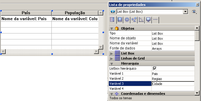 • A opção "List box hierárquico" está selecionada para o objeto na Lista das propriedades.