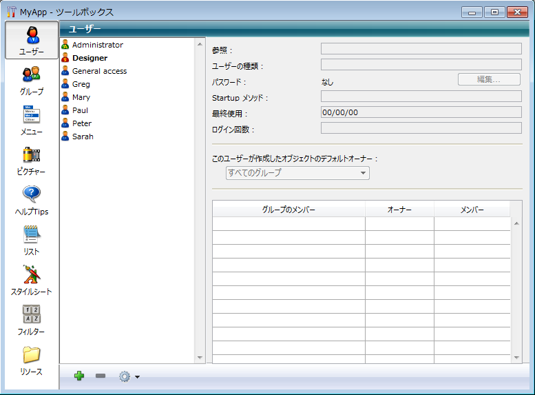 ユーザーとグループのエディターは4Dのツールボックスにあります。これらのエディターを使用して、ユーザーとグループを作成する、ユーザーパスワードを割り当てる、ユーザーをグループに入れるなどの操作を行うことができます。