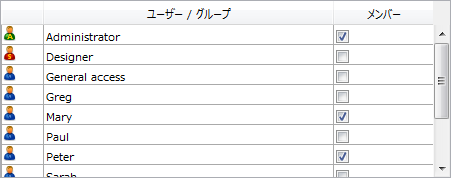 グループオーナーは、そのグループのユーザーを追加したり、削除することができます(前述のグループオーナーの節を参照)。デフォルトでは、デザイナーが作成したグループであっても、管理者はすべてのグループのオーナーになるという点に留意してください。 - メンバーエリアの該当するオプションをチェックして、グループのメンバーを設定する。