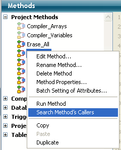 From the Explorer, you can search for a list of objects that reference a specific project method (other methods or menus). This function is available via the Search Method’s Callers command in the context menu or the options menu of the page: