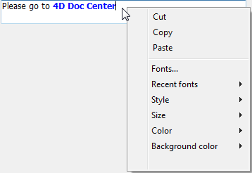 For a description of the commands that manage rich text areas and the supported <span> tags, refer to the Styled Text chapter in the 4D Language Reference manual.