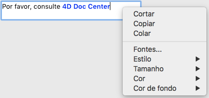 Para una descrição dos comandos que manipulam as áreas de texto enriquecido e as etiquetas <span> suportadas, consulte o capítulo Texto multi estilo no manual de Linguagem de 4D.