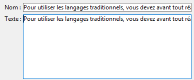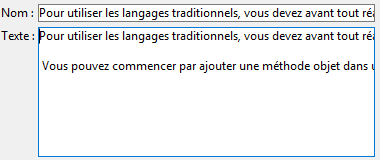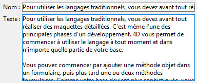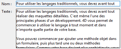 4D n’effectue aucun retour à la ligne automatique et le dernier mot affichable est éventuellement tronqué. Dans les zones de type texte, les retours chariot sont pris en charge :
