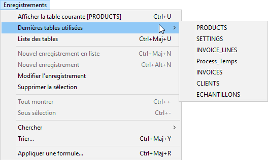 Choisissez une table dans la liste du sous-menu Dernières tables utilisées du menu Enregistrements.