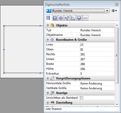 • Seine Ausmaße in der Eigenschaftenliste unter dem Thema „Koordinaten&Größe“ manuell eingeben.