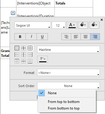 Para ordenar las categorías en un informe en tabla cruzada, abra la ventana contextual relacionada con la categoría y selecciona un valor en el menú Sentido del orden de la ventana pop up: