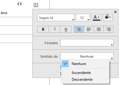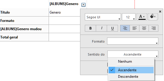 Pode especificar uma ordem  a qualquer momento usando a janela de popup associada com o cabeçalho da coluna. Pode escolher uma ordem ascendente ou descendente usando o menu Sort Order/ Escolher Ordem: